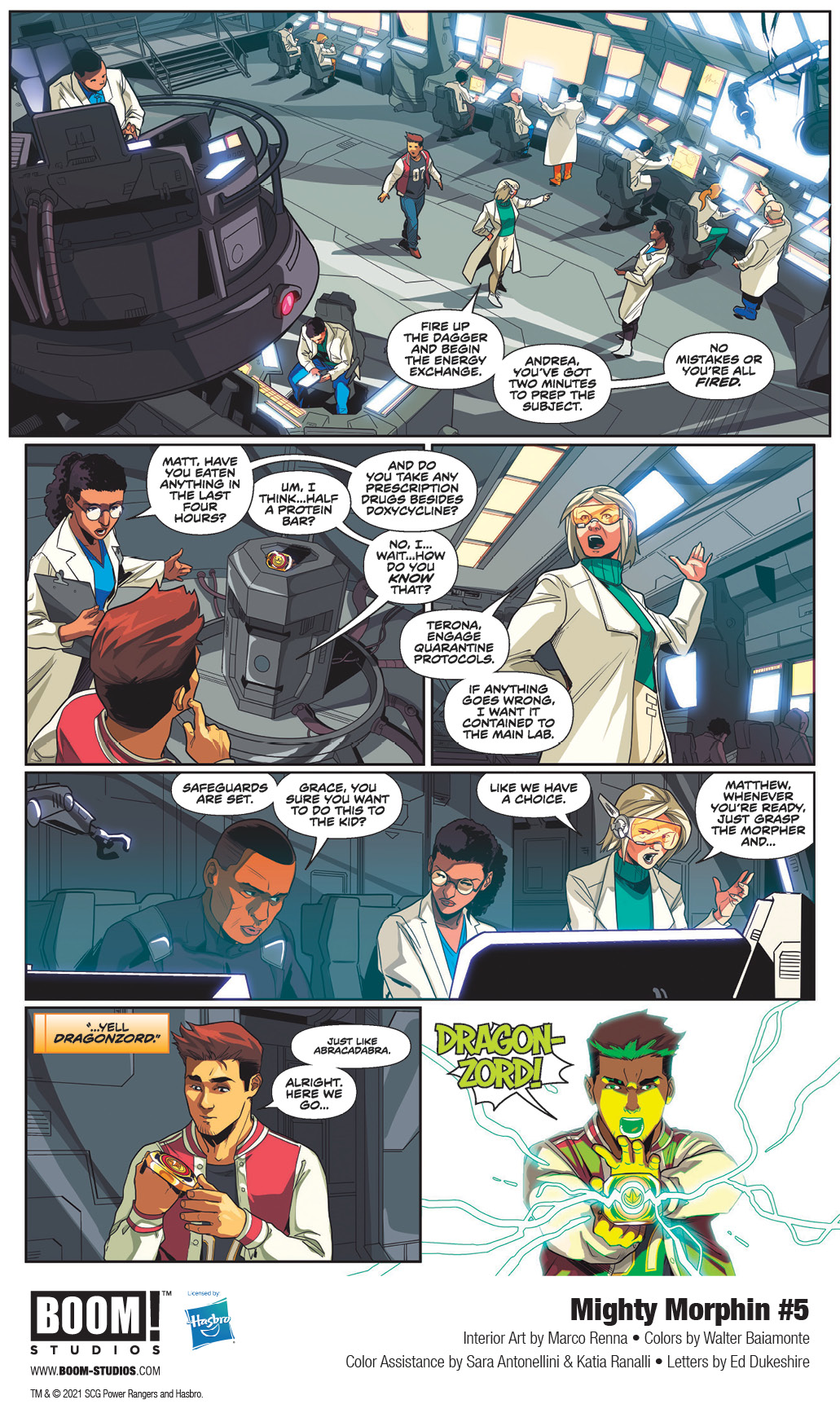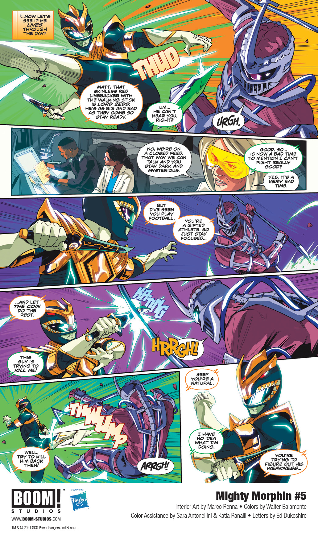 BOOM! Studios, under license by Hasbro, Inc. (NASDAQ: HAS), revealed a first look at MIGHTY MORPHIN #5, from writer Ryan Parrott (Mighty Morphin Power Rangers/Teenage Mutant Ninja Turtles), artist Marco Renna, colorist Walter Baiamonte with assistance by Katia Ranalli and Sara Antonellini, and letterer Ed Dukeshire, the exciting next issue in the ERA OF UNLIMITED POWER.