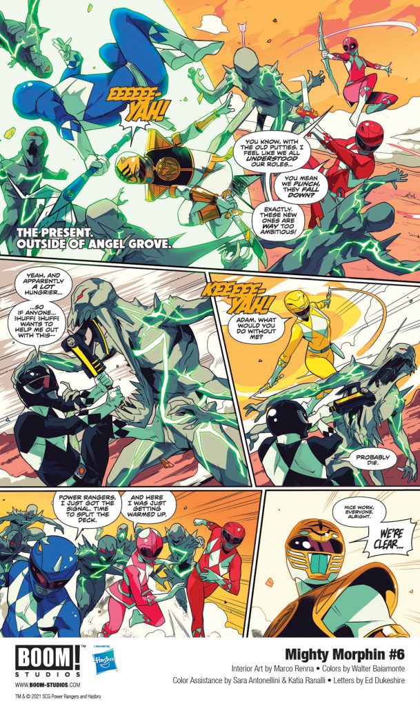 BOOM! Studios, under license by Hasbro, Inc. (NASDAQ: HAS), revealed a first look at MIGHTY MORPHIN #6, from writer Ryan Parrott (Mighty Morphin Power Rangers/Teenage Mutant Ninja Turtles), artist Marco Renna, colorist Walter Baiamonte with assistance by Katia Ranalli and Sara Antonellini, and letterer Ed Dukeshire, the exciting next issue in the ERA OF UNLIMITED POWER.