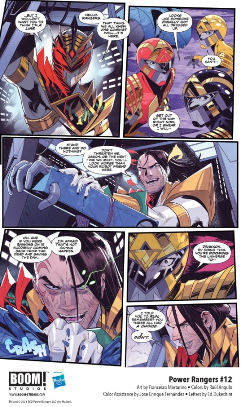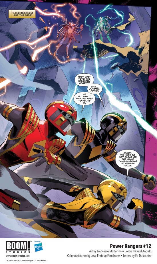 LOS ANGELES, CA (October 4, 2021) – BOOM! Studios, under license by Hasbro, Inc. (NASDAQ: HAS), revealed a first look at POWER RANGERS #12 from writer Ryan Parrott (Mighty Morphin Power Rangers/Teenage Mutant Ninja Turtles), artist Francesco Mortarino (Go Go Power Rangers), colorist Raúl Angulo (Buffy the Vampire Slayer) with color assistance by Jose Enrique Fernández, and letterer Ed Dukeshire, in conjunction with the Mighty Morphin series, setting the stage for the next epic series event, the ELTARIAN WAR, in October 2021!