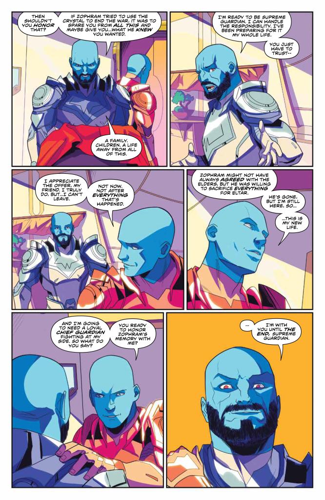 Overall – 4 out of 5: The art helps make up for the problems I had with the story, but the Juice Bar scene, added to my problems with the story, knock the score down a notch. Still, I recommend this issue, especially since it is a direct lead-in to The Eltarian War.