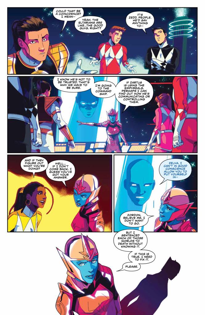 Flash forward to almost the present, specifically the point during last issue when Zartus finished talking to Tommy about trust and teleported back to his ship. This time we stay with the Rangers, who return to the main chamber of the Command Center, where they are greeted by Zelya. She explains that Lord Zedd let her go after he told her the truth about Eltar. She also reveals that there were 3 planets that she’d been sent to supervise to see if they were worthy of joining the alliance. After she had said they weren’t, they were all later destroyed by the Empyreals.