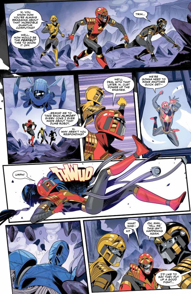 This issue picks up directly from the end of last issue. As they react to seeing the Yellow Emissary ripped apart, the Omega Rangers race back to their ship, worried about the lack of response from XI. But once they reach the ship, XI’s remains are thrown at Jason, and the team learn of Lord Drakkon’s deception. He explains that, after seeing the first Emissary die, he tried to get as far away as possible, but he was captured, and the little power he still possessed was no help. He was promised freedom, and a return to full power, if he helped them find the final Emissary. Jason offers to fight him because he doesn’t think Drakkon wants to be a bad guy anymore. But Drakkon responds by closing the door and taking off in the ship.