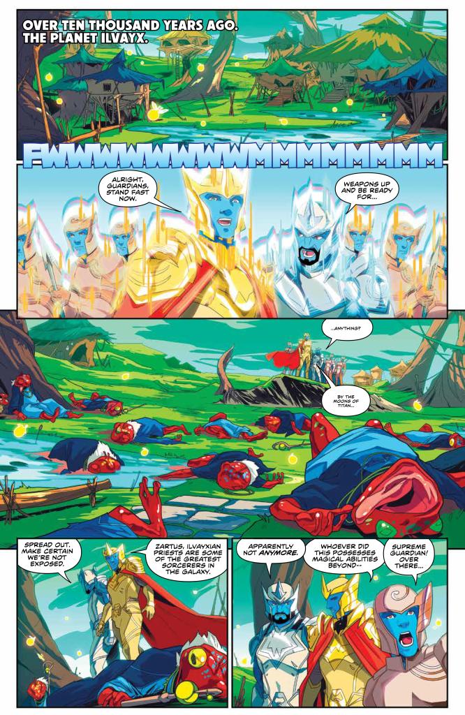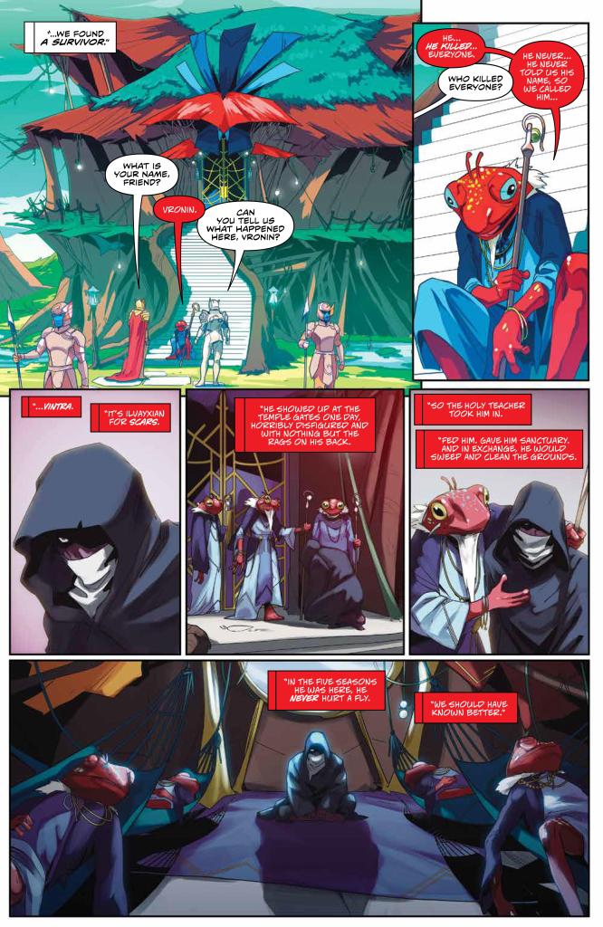 The issue begins, as usual, with a flashback to 10,000 years ago. On the planet Ilvayx, Zordon, Zartus, and a troop of Guardians teleport to the surface in the aftermath of a massacre. The priests of Ilvayx are know as the greatest sorcerors in the galaxy, and someone has killed all but one of them. The survivor, who we learn was only left alive to tell others what had happened, tells of a stranger who arrived covered in scars, and with nothing by the rags on his back. They fed him and gave him sactuary, while, in exchange, he was basically their janitor. He was there for quite awhile, observing them and learning their spells and incantations, before he was spotted perusing the forbidden scrolls. Soon after, he began his attack. He hit them with powerful magic blasts, and was able to counter every spell they threw at him. When it was all over, he just disappeared.