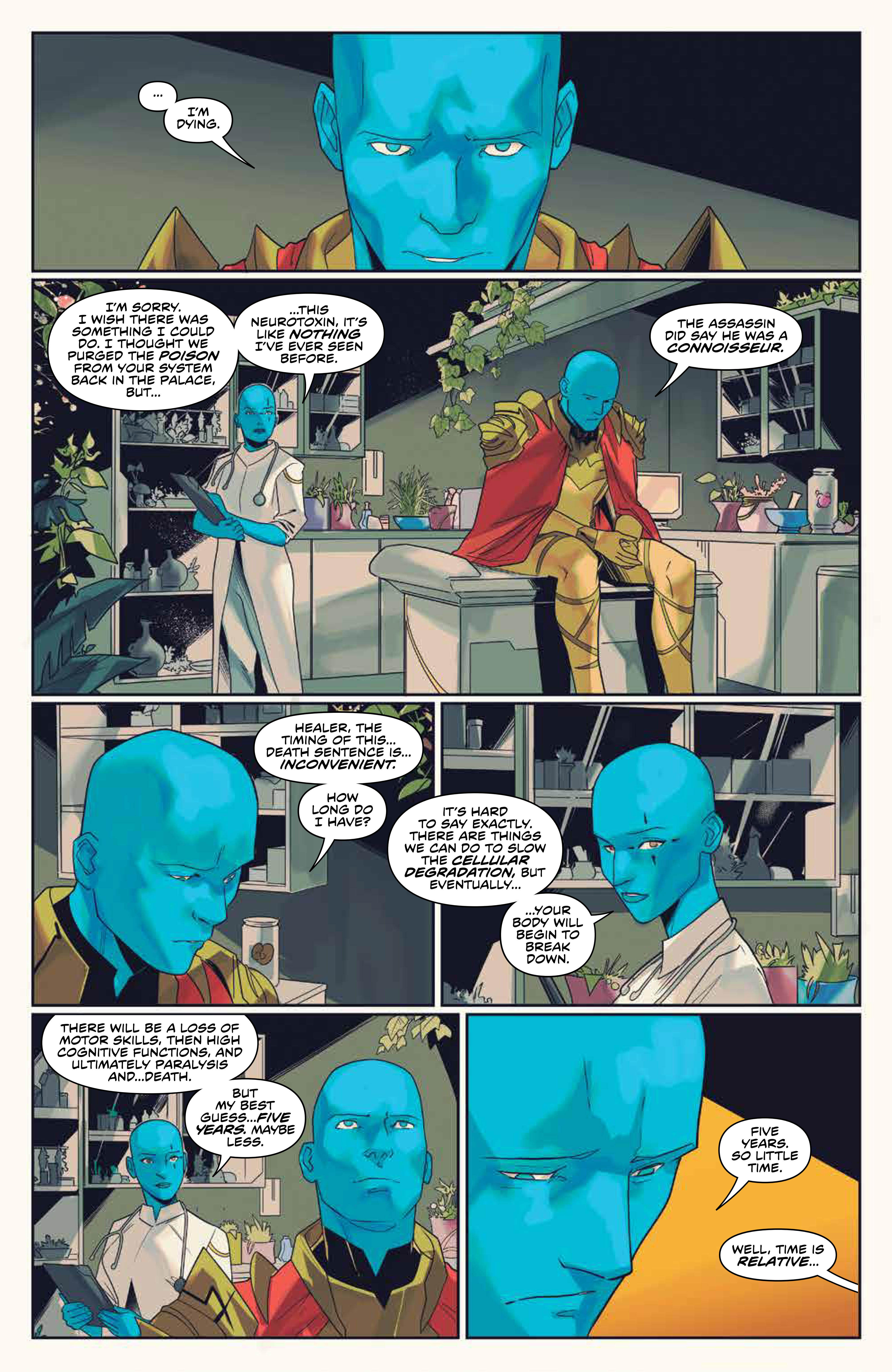 Elsewhere, a young Zordon is taking a break from the Harvest to enjoy an evot. Billy shows up again, but when Zordon tries to return to his work, Billy reminds him that the Power Rangers need him. This brings him back and he basically explains that he has failed everyone, and his decisions and guidance have lead them to the brink of destruction. But, Billy reminds him that Zordon himself once said that failure is a choice that only begins when you stop trying. With that, Zordon is ready to return, although he’s not sure he’ll be much help with the Command Center destroyed. Fortunately, Billy has a solution to that problem.
