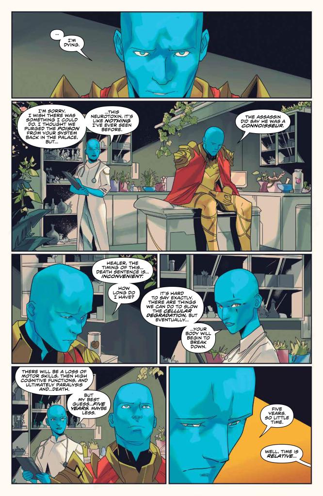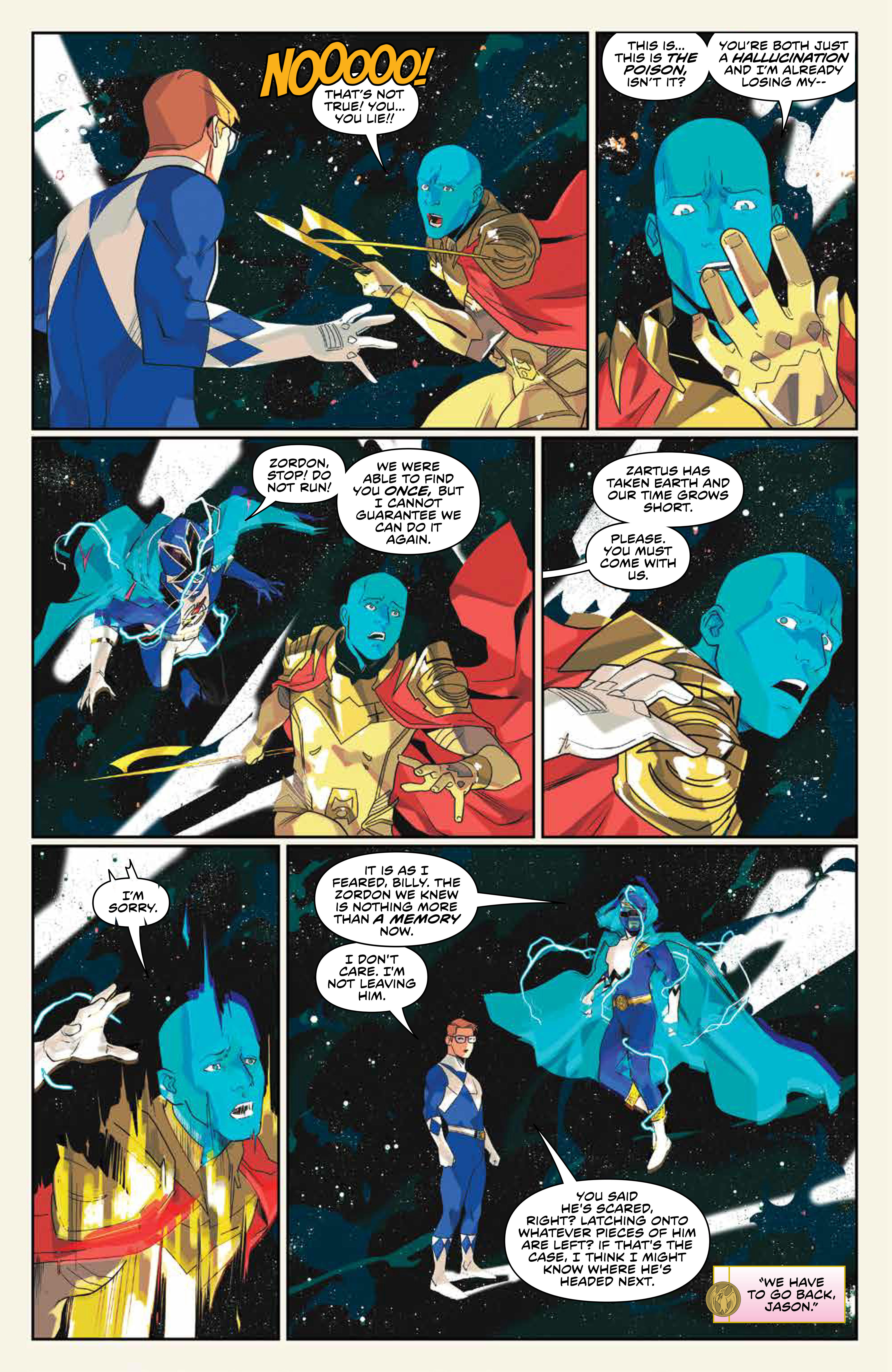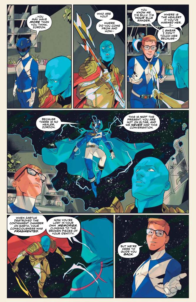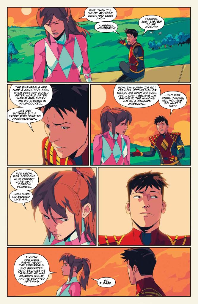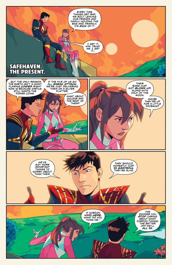 Back in the present, Jason and Kim are in Safehaven, having successfully escaped all of the destruction last issue. Kim wants to go back because she feels guilty for running, but Jason does not want to go in half-cocked on what would essentially be a suicide run. He eventually convinces her to stay, but she notes that he’s starting to sound like Zordon, and warns him to not make Zordon’s mistake of not listening to the others.