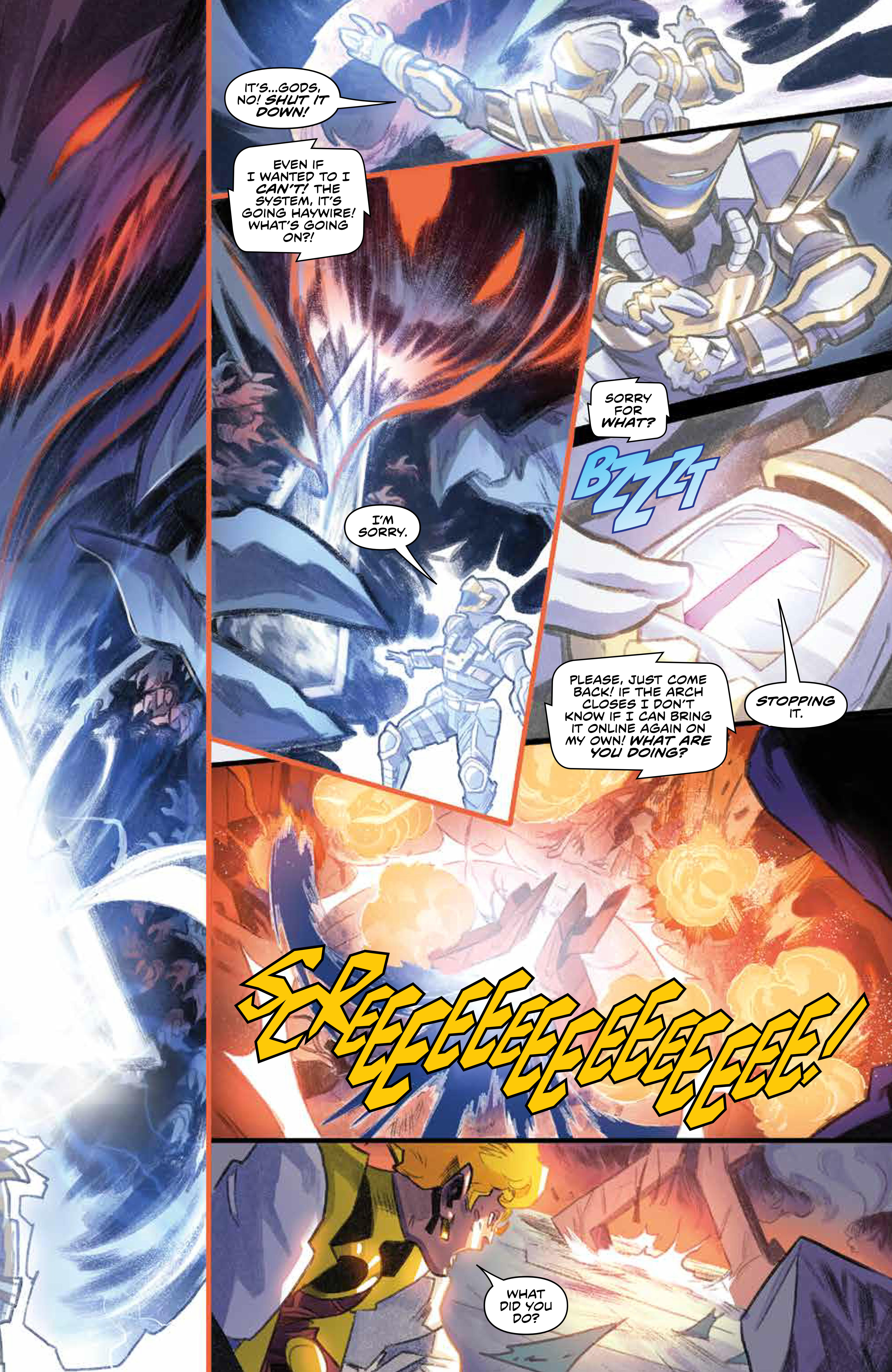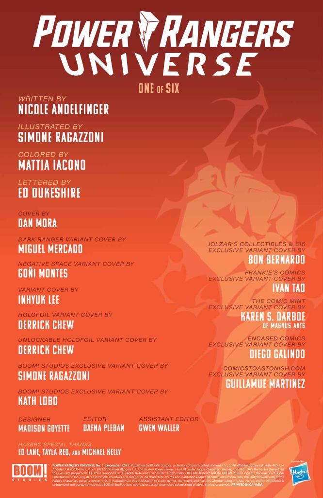 Art – 3 out of 5: Simone Ragazzoni’s art is influenced by Joe Madureira, who’s art has an anime influence as well. It looks great, but the layouts can be confusing. Each page is very busy, with a lot of overlapping. In some cases, such as page one, it’s only because of the dialog that I was able to follow the panel progression. But in other cases, such as when they were watching the video, with limited dialog caption boxes, I was completely lost. I thought the creatures were the ones we’d seen from the Morphin Grid earlier in the issue, and needed to look it over several times to realize they had crashed down to the planet from space. At some point, someone asks what happened to the Arch, but it doesn’t look like anything has happened to the Arch.