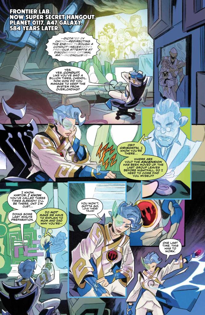 584 years later, Frontier Lab is known as Super Secret Hangout. A young scientist named Ori is trying to open her own Arch using the video notes from the flashback, but it doesn’t work. Unfortunately, she doesn’t have time to try again because the planet is undergoing a major evacuation. Masterforges are dropping all communications, leaving Planet 0117 as the last remaining Masterforge. It’s people are ascending to the Morphin Grid for safety. Despite her brother, Kartor’s, pleadings, Ori is running late.