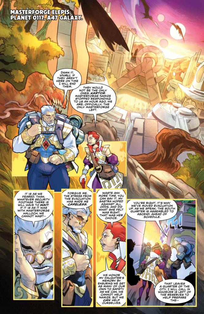 Elsewhere, Ori’s friend Rhian overhears a discussion between her mom and Kartor in which he mentions that there is video from the Masterforge Namize, which dropped all communication just an hour ago. And since her sister was at that Namize, and despite her friend Phiro’s protestations, she wants to see the footage. For some reason they go to see their friend Telosi to tell him about the footage. A man named Xev is also missing from Namize, which has Telosi very upset. So he decides to tag along with the other 2 to find Ori.