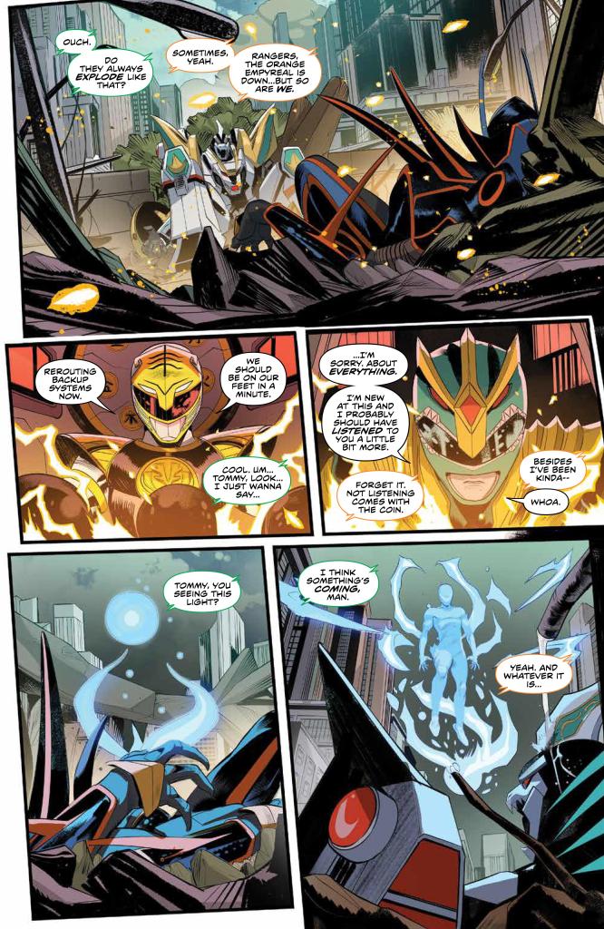 Art – 5 out of 5: This time out, Francesco Mortarino handled the part of the story featuring the Rangers fight with the Empyreals, while Marco Renna handled the fight on the moon. Not sure if this was always the plan, or if Mortarino was running behind schedule, but it works. Their styles are different enough that you could tell the difference, but similar enough that the change wasn’t jarring. Mortarino puts a lot of neat details in the Zord fights, and Renna does a great job with the moon fight. Although, it is weird seeing Zedd taking hits in a fight, since we really only ever saw him in 2 fights on the show (against Tommy in MMPR Season 3, and against everyone in Dino Fury), and, despite losing one of them, I don’t really recall him taking and actual hits.