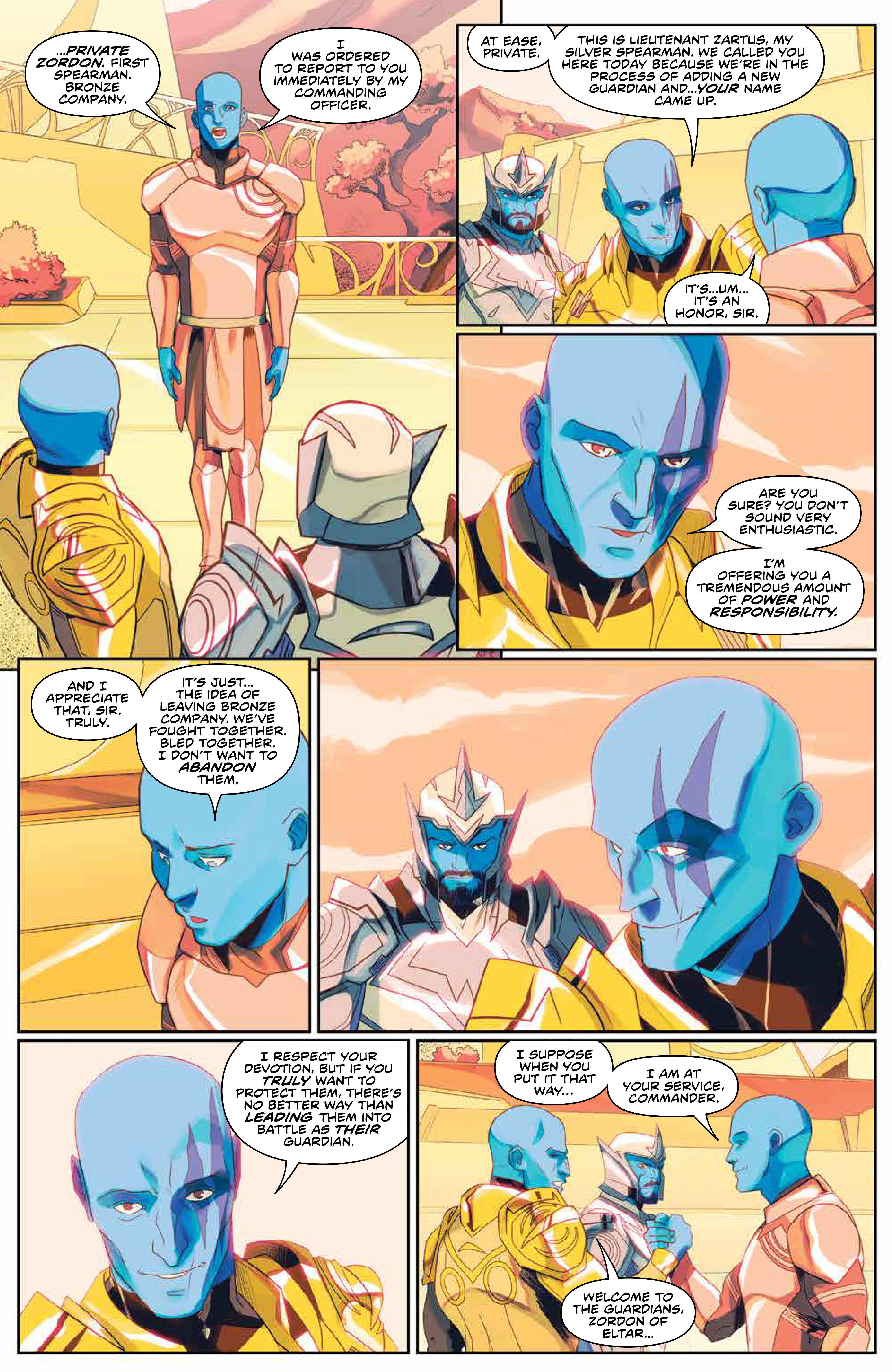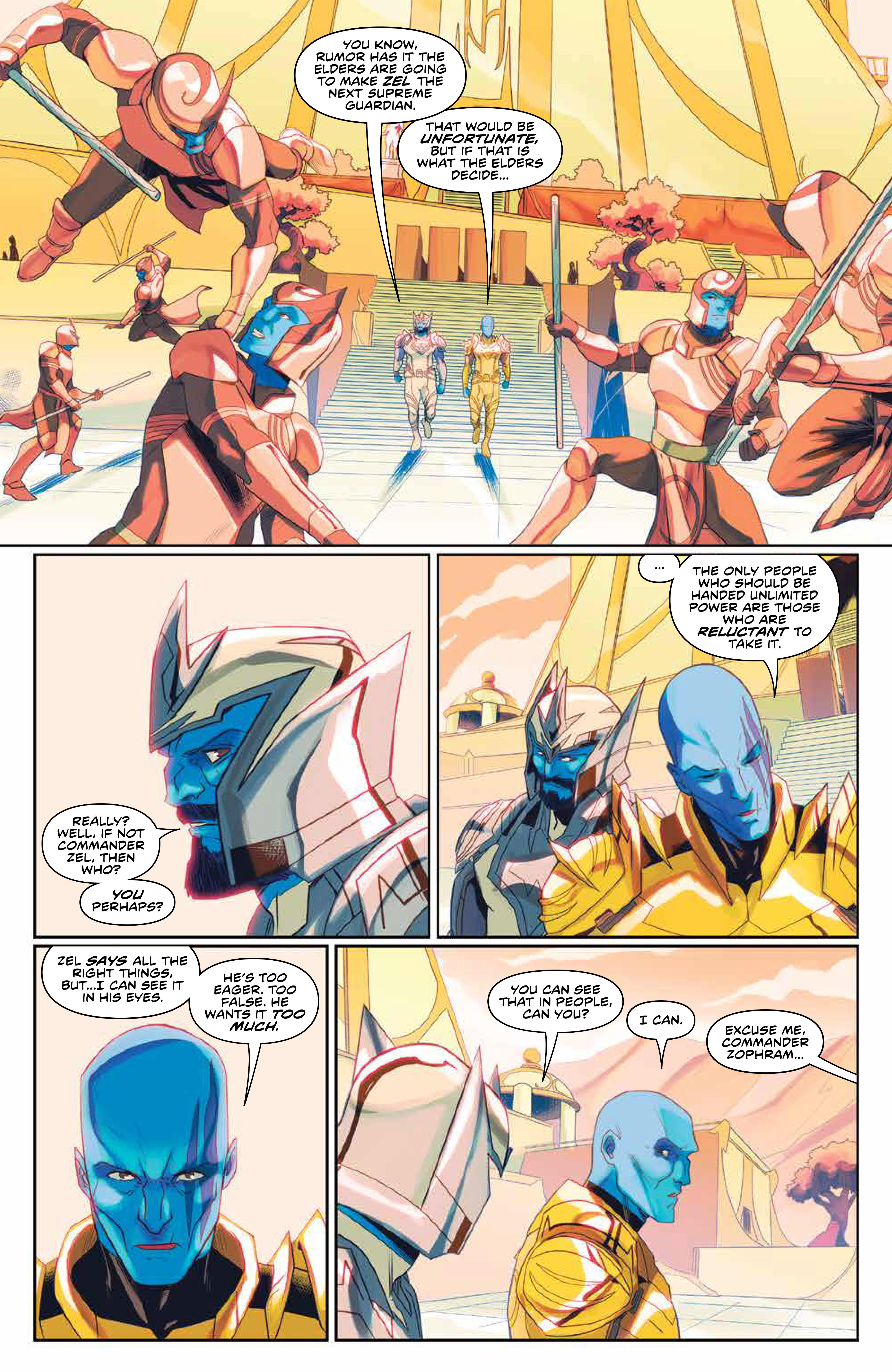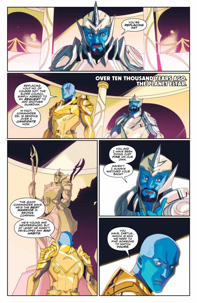Over 10,000 years ago, Zophram tells Zartus of his plan to add another Guardian to the team. Zartus believes he is being replaced, but Zophram assures him that this is merely an addition to the team. Someone to watch Zartus’ back, while he’s busy watching Zophram’s back. They are soon met by, and welcome, their new friend, named Zordon.