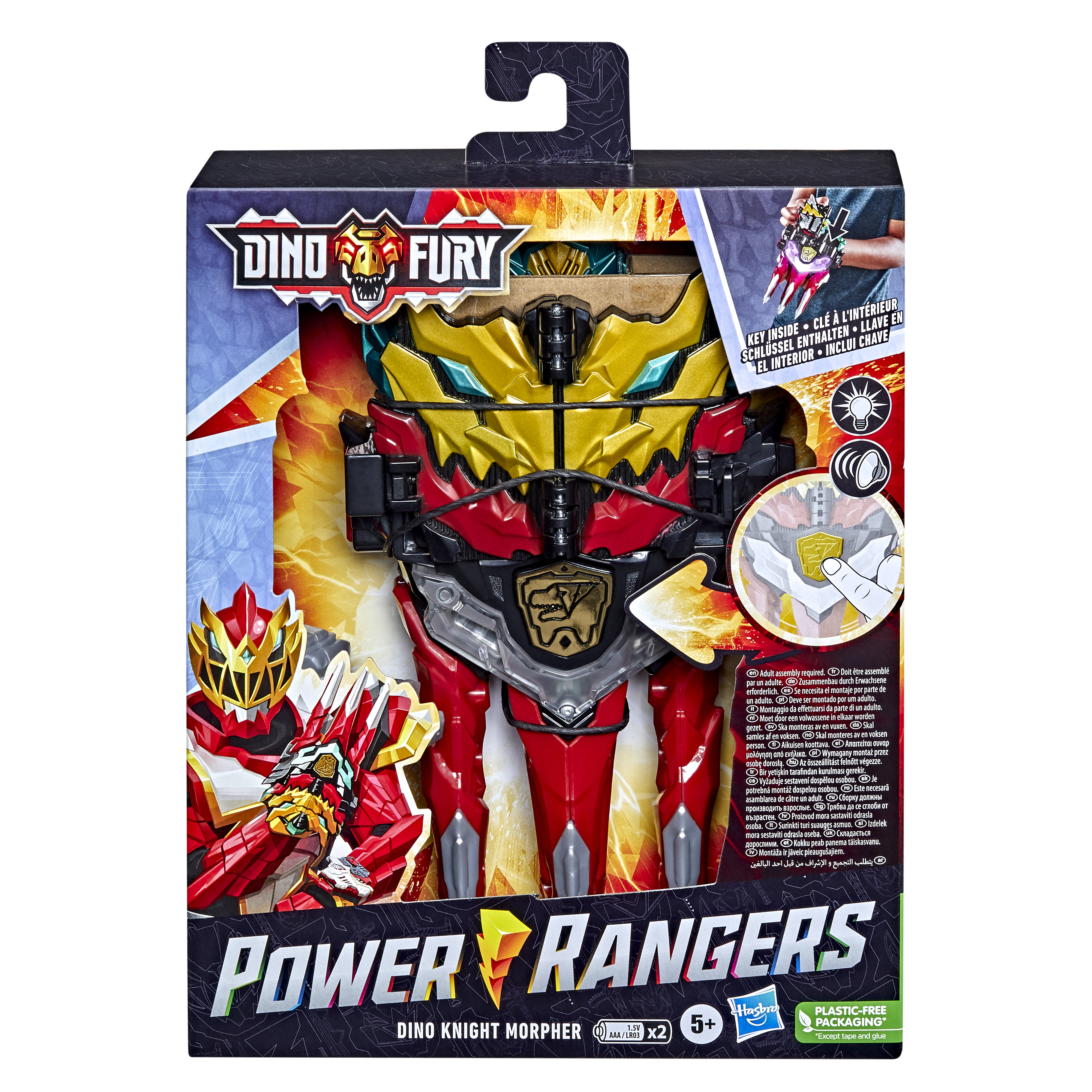 When an army of powerful alien beings is unleashed on Earth threatening life as we know it, a brand-new team of POWER RANGERS, fueled by the pre-historic power of the dinosaurs, are recruited to deal with the threat in the POWER RANGERS DINO FURY TV series! The POWER RANGERS DINO KNIGHT MORPHER is an electronic toy that features light effects and sounds inspired by season two of the POWER RANGERS DINO FURY, so kids can imagine upgraded morphing action. The lights and sounds of the Morpher are motion reactive and change as kids move! Plus, the DINO KNIGHT MORPHER has special elemental modes that can be activated when kids point the Morpher in a certain direction: down for lightning, up for fire, or straight ahead for ice modes! Insert the included Dino Knight key into the top of the Morpher to unlock even more sounds, inspired by the TV show when the Red Ranger morphs into the upgraded Dino Knight Mode! The DINO KNIGHT MORPHER is also compatible with the keys included with the Dino Fury 6-inch action figures. This Morpher can fit two Dino Fury keys at once! Figures with keys each sold separately. Find other POWER RANGERS figures and gear, including POWER RANGERS DINO FURY toys, to expand the morphinomenal action. Each sold separately. Available now at most major toy retailers nationwide