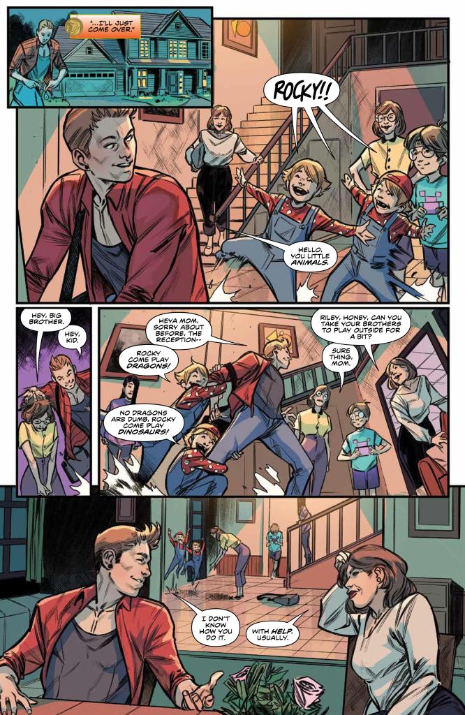 Speaking of families, Rocky gets a call from his mom, and returns home. Apparently, all the recent events in Angel Grove have caused her company to consider shutting down the local branch office, so she has to fly down to Dallas to save her job, and needs to Rocky to watch his 4 siblings while she’s gone. Rocky can’t come up with a valid cover story on the spot, but is temporarily saved when his sister barges in with news that something is happening to the moon. While the art seems to indicate that it has been eclipsed, the moon has apparently disappeared!