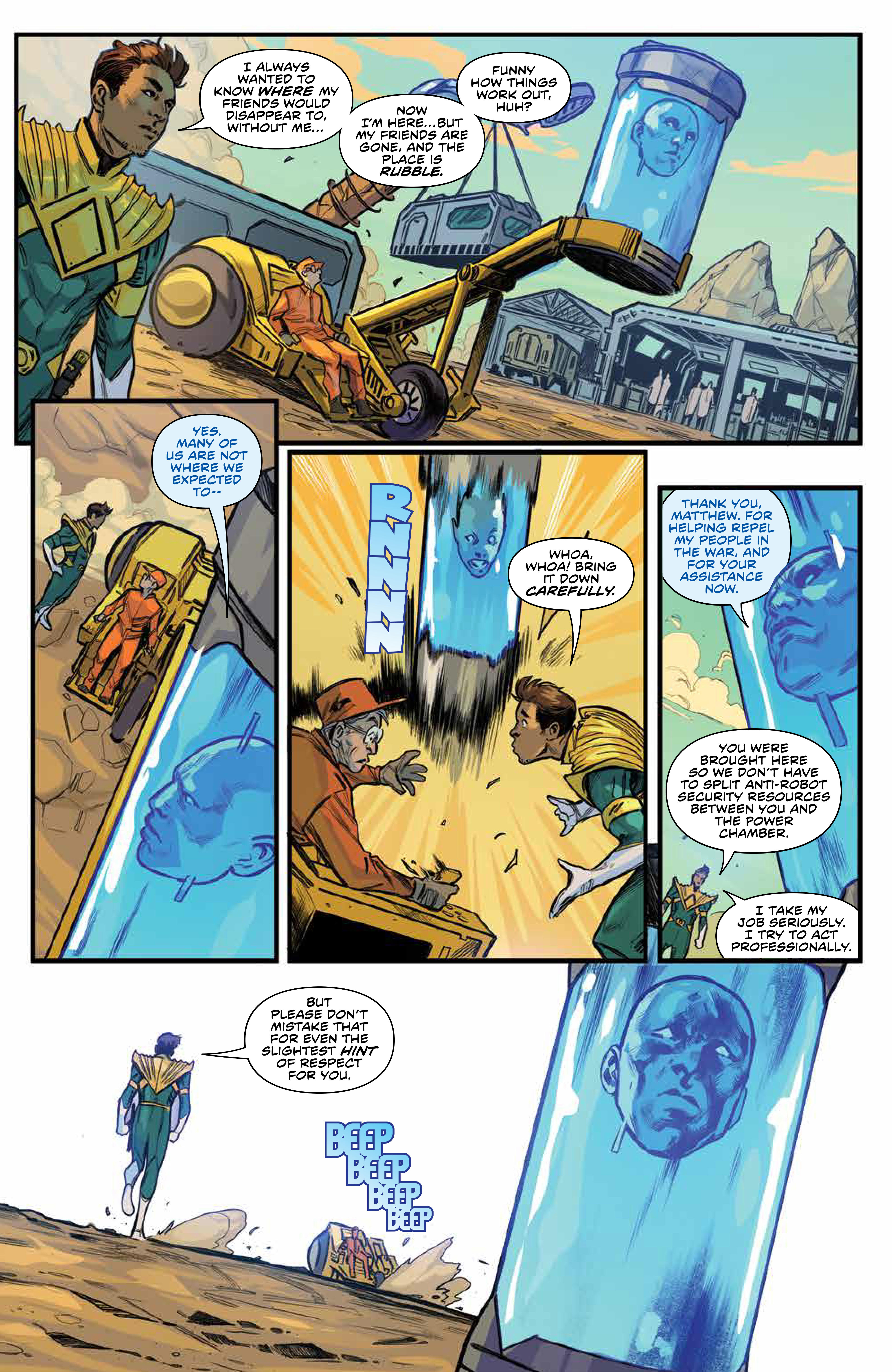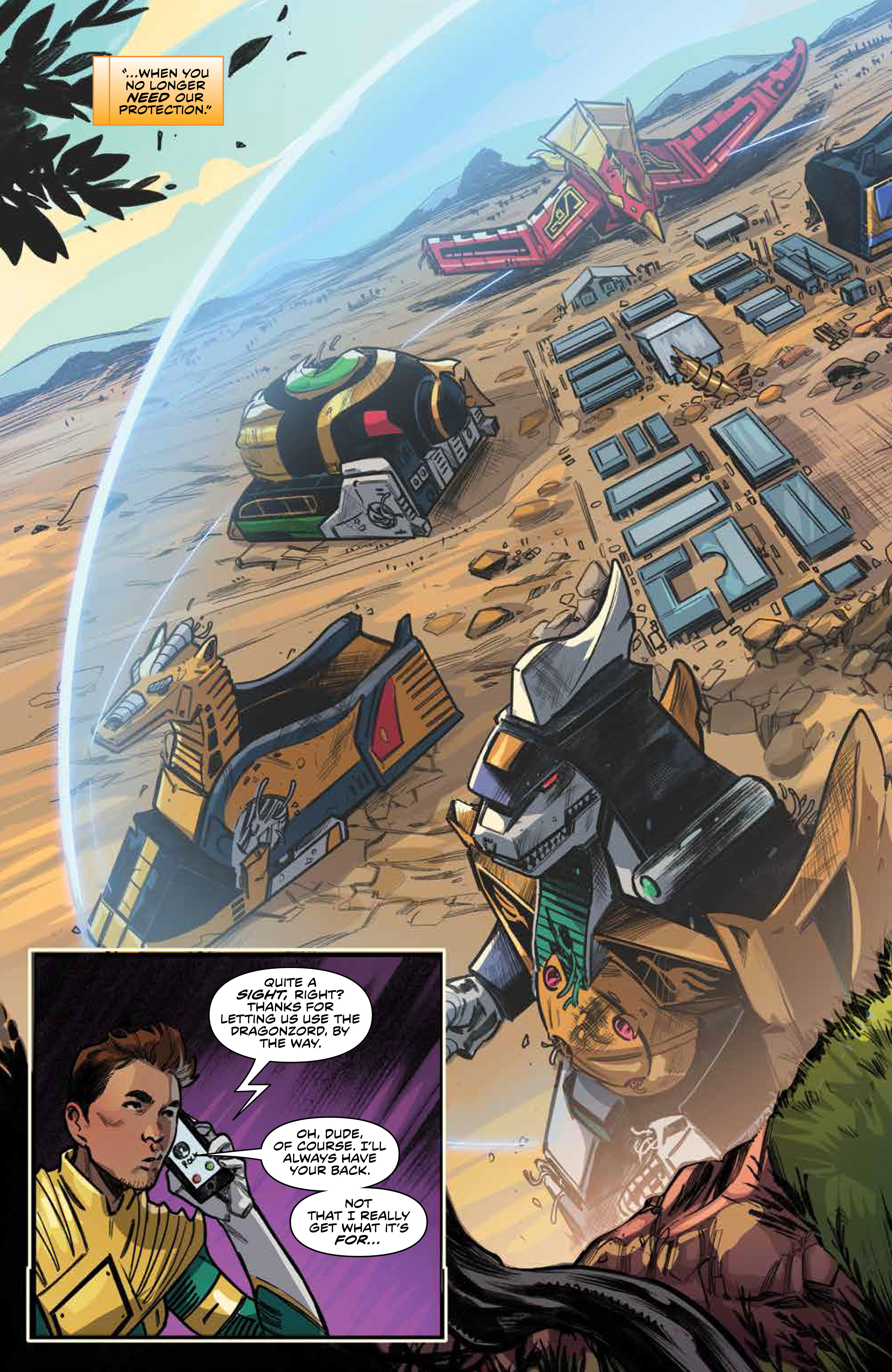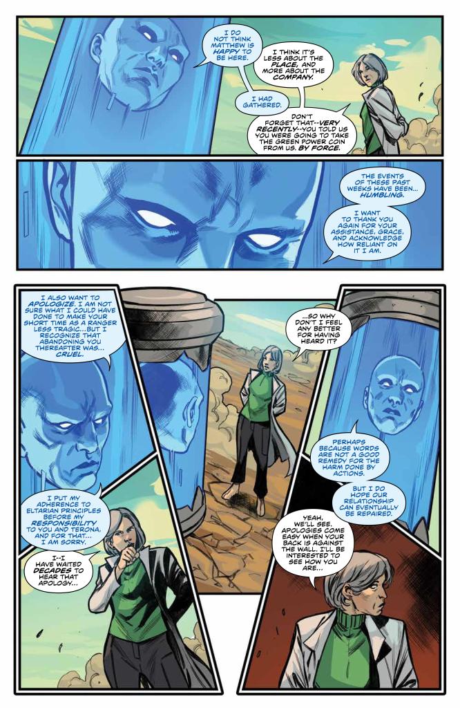 Ranger, and Matt, the Green Ranger, wait in tense anticipation for the return of the Away Team. Emotions run high as Zordon acknowledges a hidden history involving him and Promethea, and how much