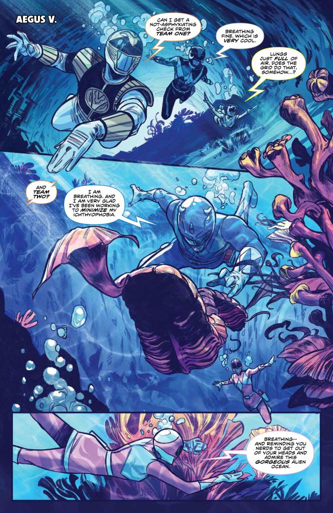 Story – 3 out of 5: Boy, this was a very quick read. The 2 plots are nudged forward, but due to the uncompressed, write-for-the-trade storytelling, only just a bit. I would think Rocky would have thought twice before bringing the kids to the Command Center site, and I would think both Zordon and Grace would have vetoed the idea as well. As for the other Rangers, it was cool to see them swimming. Due to technical and budgetary restrictions, we have yet to really see Rangers swimming on the show in any believable fashion. Even the Aquitians never actually swam! As such, seeing them swim here, as well as their reactions to such a feat, was pretty cool! Not exactly sure how they were able to talk to the locals in the water, physics have never been a big deal in Power Rangers.