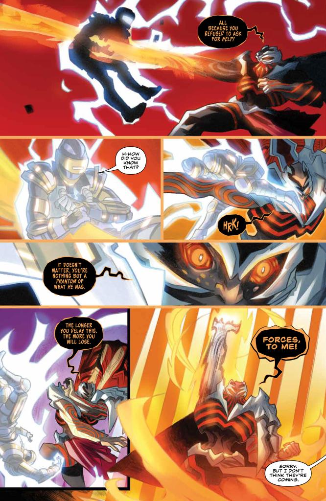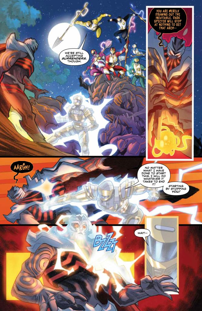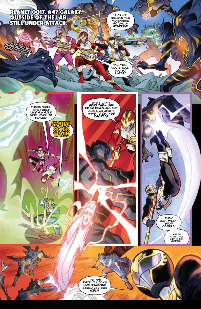 Art — 3 out of 5: So, are these Rangers able to fly or not? During the fight, they barely keep their feet on the ground. And I’m not sure what’s going on on page 6, which you can also see in the preview above. Morphinaut is getting hit by something, but I cant tell how Chendil is attacking him. Once things slow down a bit, the art gets much better, despite losing track of Kartor after he mentions at problem with the energy spiking. The change to the eyes, and the purple wisps, are good artistic indicators of what is happening, even if the characters don’t seem to notice.
