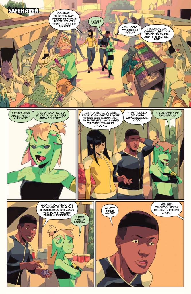 Story — 5 out of 5: There was a lot to like here. Journey has gotten much older while the Rangers were on Earth, and now she and Zack are having the classic father/teenage daughter type arguments. Based on Kevor’s previous appearance, Zack is valid in trying to keep Journey away from him. But, while they were gone, Kevor also has matured, and is a lot more decent than Zack knows. The bad guys have finally arrived after being seemingly forgotten, and look poised to cause some major problems in Safehaven. And, while I don’t like what Andros is doing, I find myself interested in seeing where his story goes, and how they will redeem him in time for Power Rangers in Space. I was also surprised that the black suit is just a costume/uniform, and that he isn’t morphed. As for the conclusion, I am looking forward to what happens with Zhane as well. Based on Andros working with him here, I’m guessing the Death Ranger has possessed Zhane, which, considering why he was on ice in the first place, should be a problem. I wonder if Andros knows this, or if he thinks Zhane has been revived.