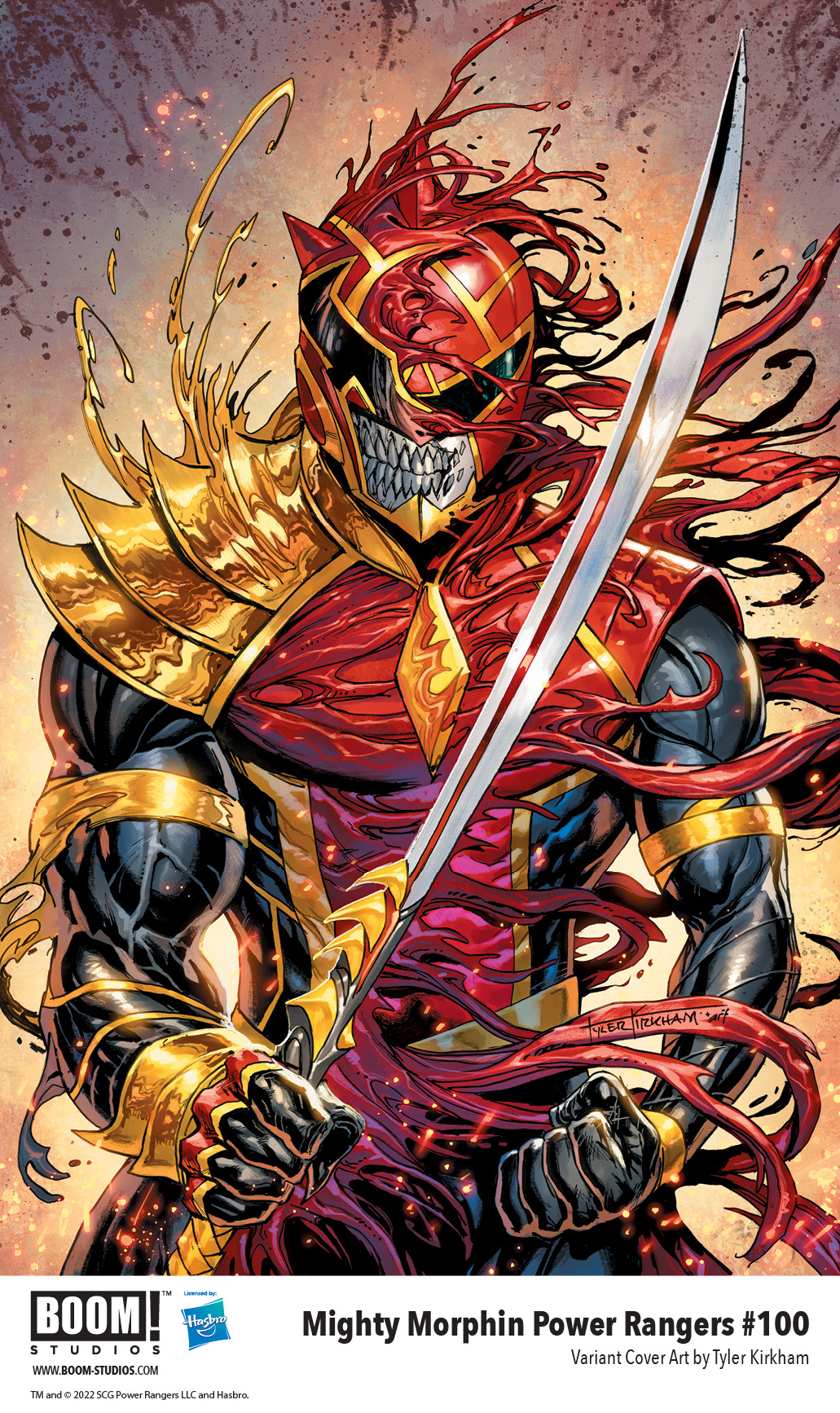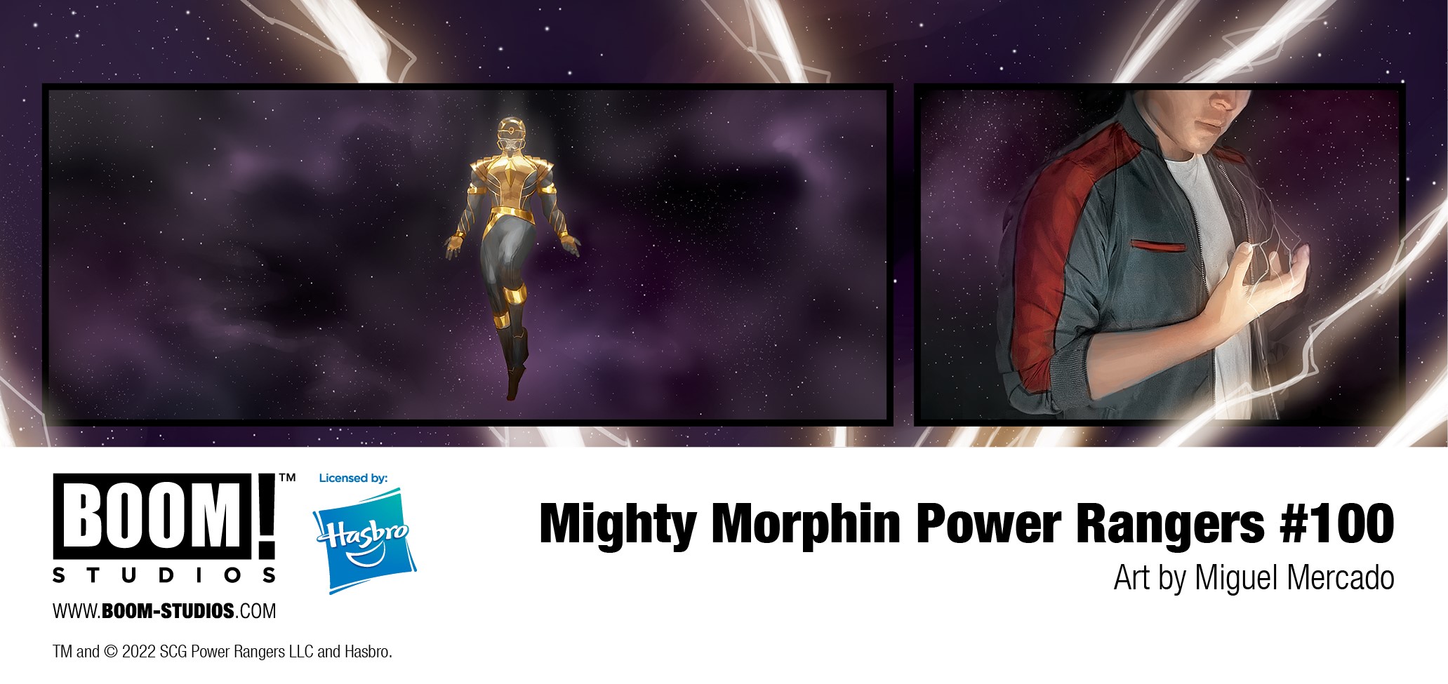 Print copies of MIGHTY MORPHIN POWER RANGERS #100 will be available for sale on September 28, 2022 at local comic book shops (use comicshoplocator.com to find the one nearest you) or at the BOOM! Studios webstore. Digital copies can be purchased from content providers like comiXology, iBooks, Google Play, and Kindle.
