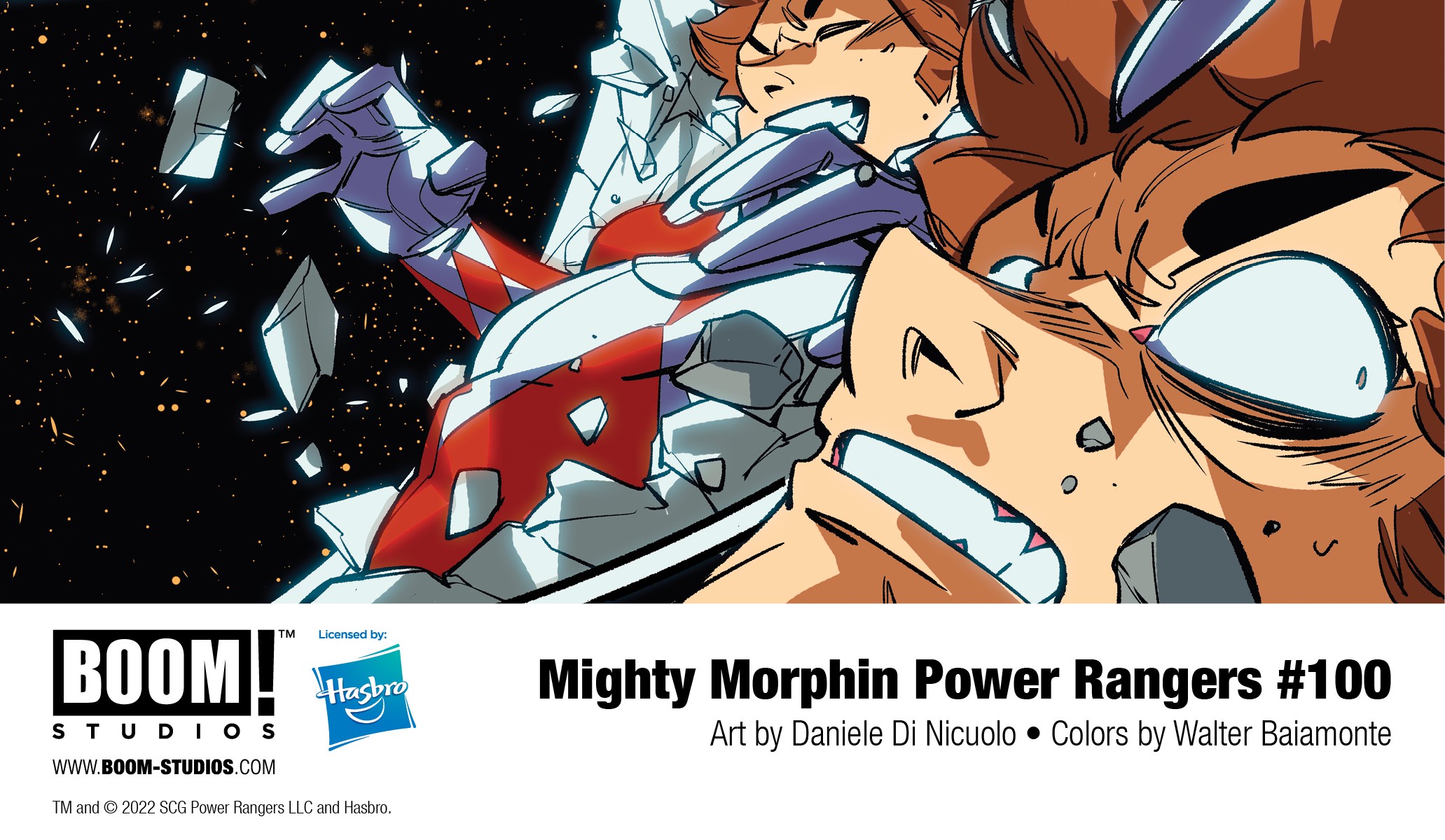 LOS ANGELES, CA (August 25, 2022) – BOOM! Studios, under license by Hasbro, Inc. (NASDAQ: HAS), revealed a first look at the historic milestone issue of the bestselling comic book series based on the global pop culture phenomenon with a special oversized issue, MIGHTY MORPHIN POWER RANGERS #100. The CHARGE TO 100 builds to a celebratory and shocking 100th issue from acclaimed writer Ryan Parrott (Mighty Morphin Power Rangers/TMNT), series artists Marco Renna and Moisés Hidalgo, with colorists Tamra Bonvillain and Matt Herms, as well as the return of several all-star fan favorites as guest artists on this epic culmination of a story years in the making, available in September 2022.