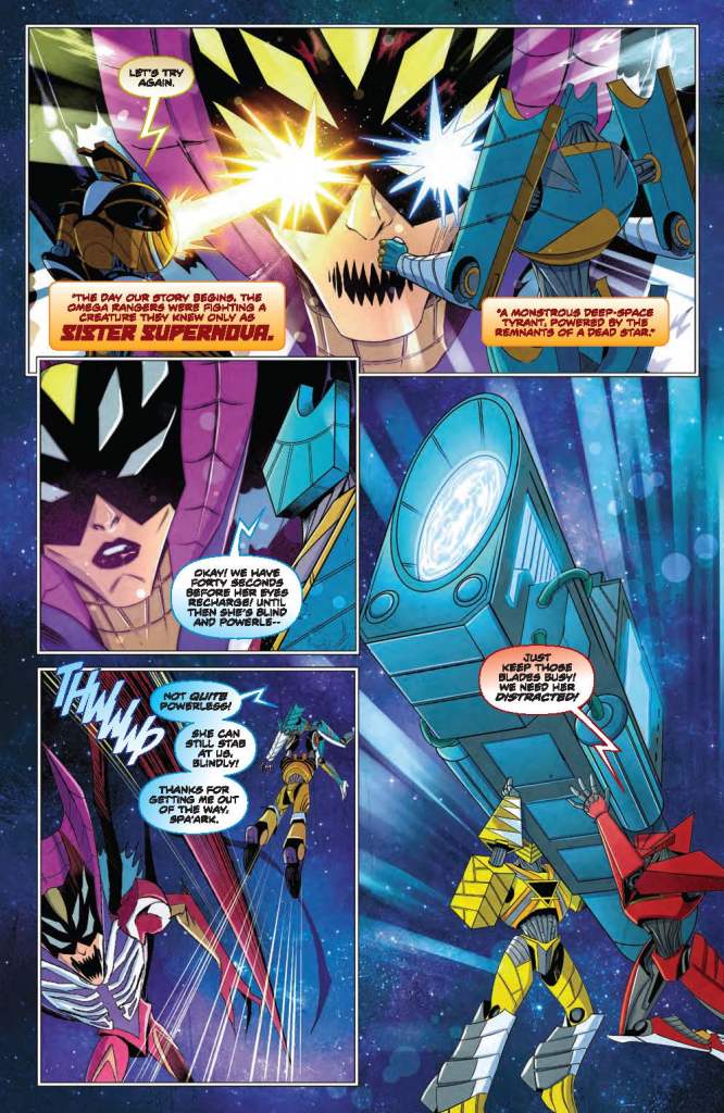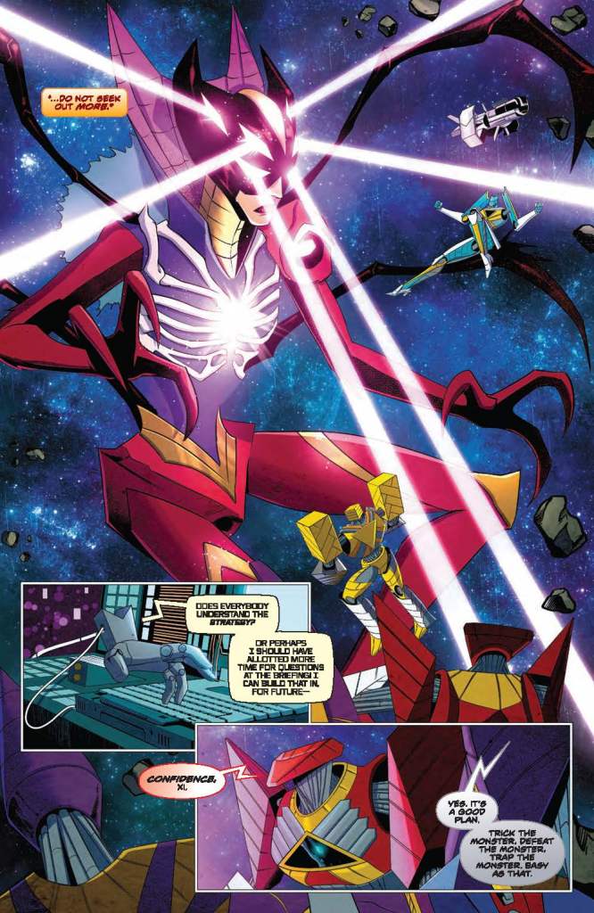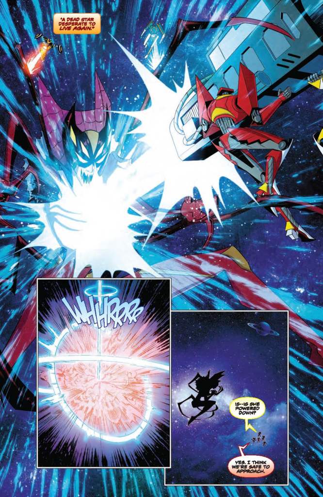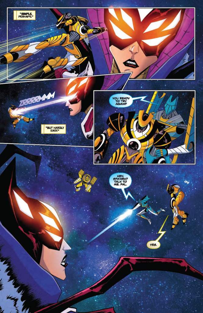 Art – 4 out of 5: The art here is rather well done. And, even though there were 2 artists, the art styles are similar enough that it doesn’t take you out of the story when the change occurs. Interesting art choice to just have the mouthpiece become more skeletal after Haza returns. But again, since that happened to Zhane, Jason, and Yale’s helmets after they were possessed, perhaps it is just a sign that Spa’ark has been possessed too.