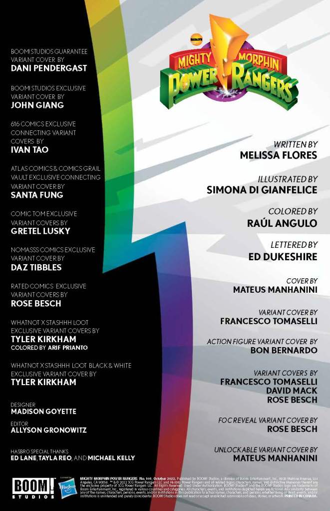 Synopsis: The CHARGE TO 100 brought everything together in Mighty Morphin Power Rangers #100. Now discover the bold new future for the bestselling franchise! Writer Melissa Flores (Power Rangers, The Dead Lucky) and artist Simona Di Gianfelice (All-New Firefly) reunite all of your favorite Rangers, recharged and ready for a bold new direction for your favorite Teenagers With Attitude that begins right here!