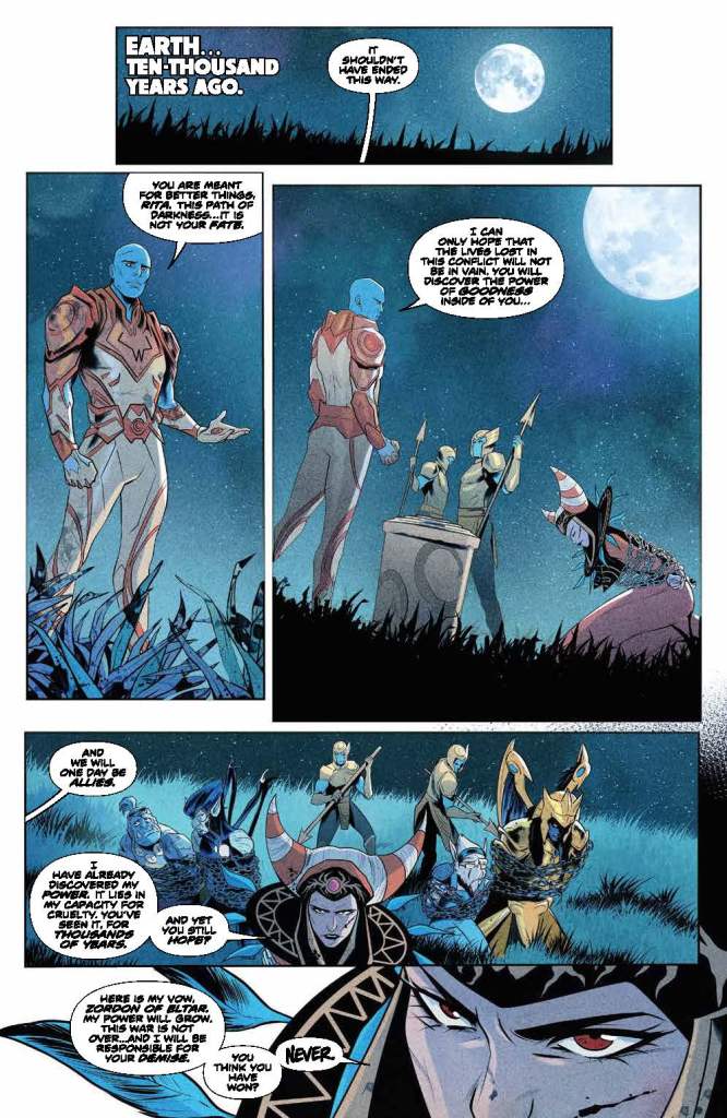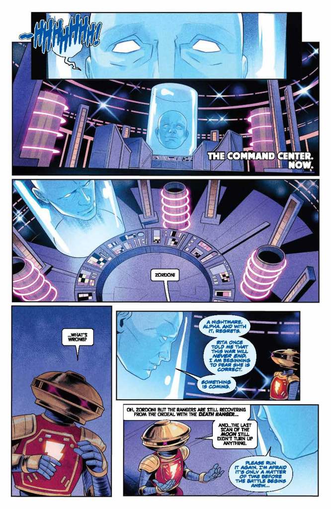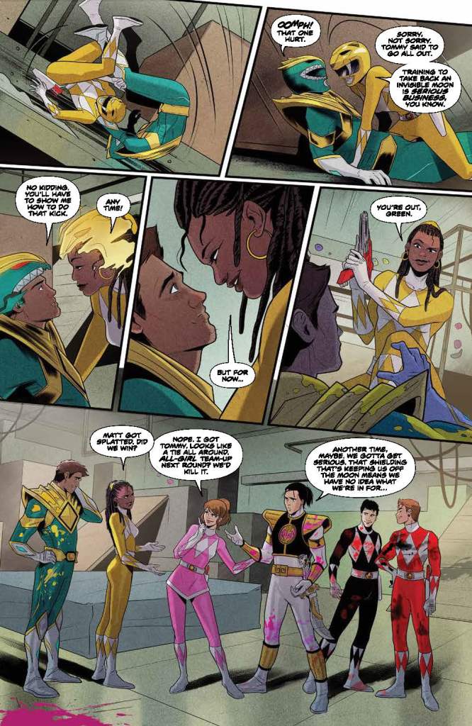 Story — 5 out of 5: What a great start to a new era of Power Rangers comics! We start off finally seeing the moment that Rita turned Zordon into the floating head lost in a time vortex that we all know and love Although it is in a dream sequence, giving future writers leeway if they want to revisit the scene later on. The girls winning the paintball battle is not only a nice nod to the all female creative team, but, based on previous issues and storylines, is completely believable. A possible romance between Matt and Aisha is intriguing, and I look forward to seeing how that plays out.